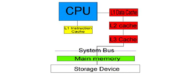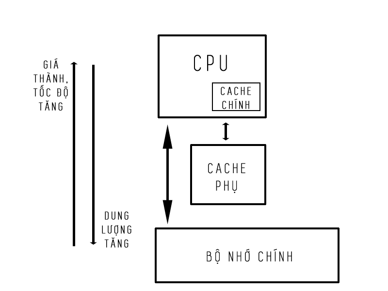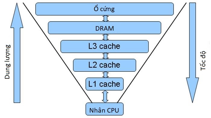 Bộ nhớ đệm thường được chia thành 3 “tầng”, bao gồm L1, L2 và L3 (L: Level). Về dung lượng, kích thước của L3 sẽ có kích thước cực lớn, L2 nằm giữa và L1 là nhỏ nhất. Về tốc độ, L1 là nhanh nhất, L2 ở giữa và L3 là thấp nhất. L3 sẽ nhận dữ liệu từ DRAM (thanh RAM cắm vào mainboard của bạn). L2 là lớp chuyển tiếp giữa L1 và L3. L1 sẽ đổ dữ liệu trực tiếp đến các lõi CPU để xử lý.