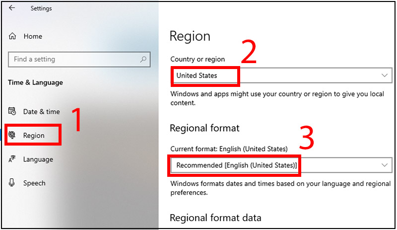 Bước 3: Chọn tab Khu vực ở cột menu bên trái > Chọn khu vực là United States > Chọn ngôn ngữ là tiếng Anh (United States). Bạn cũng có thể chọn một trong các ngôn ngữ khác được đề cập ở trên để thuận tiện cho bạn.