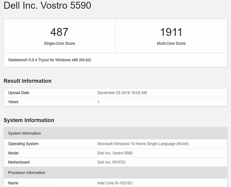 Để đánh giá cấu hình và hiệu năng của Dell Vostro 5590 Core i5, mình đã sử dụng phần mềm Geekbench 5 và đo điểm trung bình. Khi chạy CPU, chúng ta sẽ nhận được điểm đơn lõi là 487 điểm, ở đa lõi thì đạt 1.911 điểm.