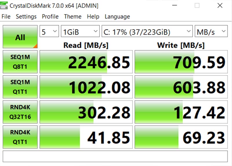 Đồng thời, mình cũng sử dụng phần mềm CrystalDiskMark để đo độ nhanh của sức đọc và ghi của ổ cứng SSD 256 GB. Kết quả, ổ cứng SSD đạt tốc độ đọc 2.246 MB/s và tốc độ ghi 709 MB/s. Theo mình, với cấu hình này bạn có thể chiến các game như Liên Minh Huyền Thoại hay PlayerUnknown’s Battlegrounds bằng một số công cụ như Photoshop, Lightroom.