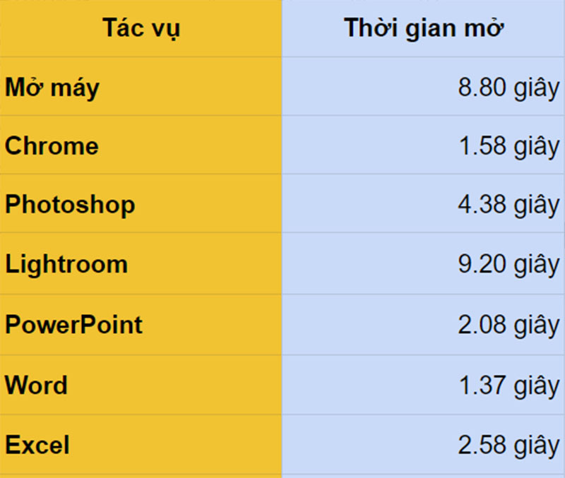 Ngoài ra, mình cũng làm bảng đo thời gian mở thực tế của các ứng dụng phổ biến trên Dell Vostro. Như ảnh bên dưới có thể thấy Dell Vostro 5590 cho tốc độ nhanh và thời gian mở khóa ứng dụng ngắn.