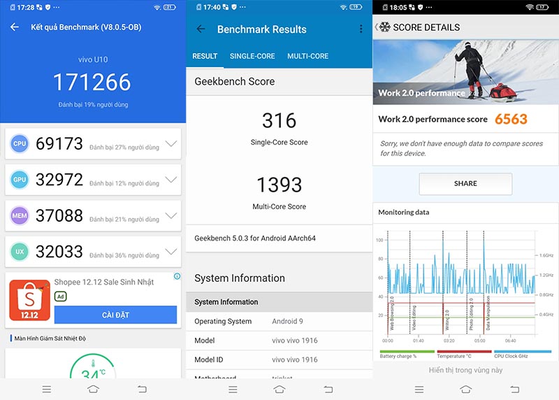 Mình đã test cấu hình và hiệu năng nhanh bằng các phần mềm chấm điểm quen thuộc, đó là: AnTuTu, GeekBench và PCMark.