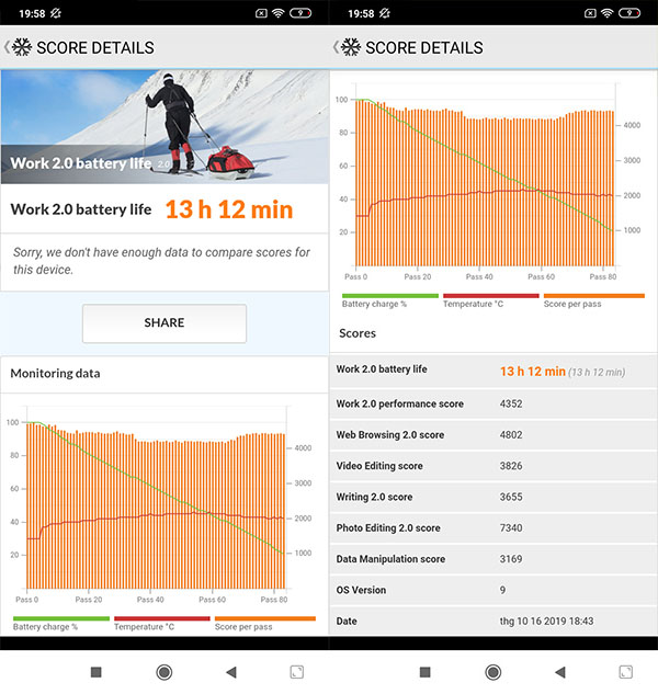 Khi kiểm tra pin của Redmi 8 bằng ứng dụng  PCMark, kết quả cho thấy máy có thể hoạt động liên tục hơn 13 giờ.