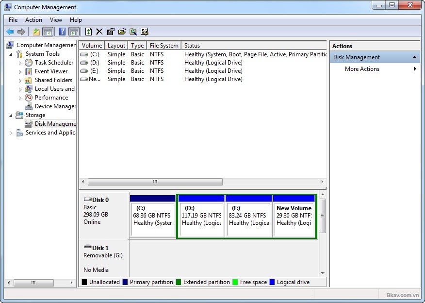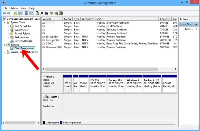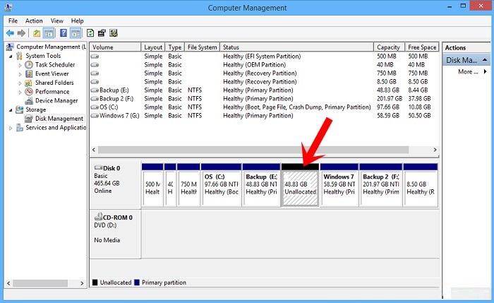 - Bước 2: Ở cột bên trái, chọn “Disk Management”, chúng ta sẽ thấy các phân vùng ổ cứng ở bên phải.